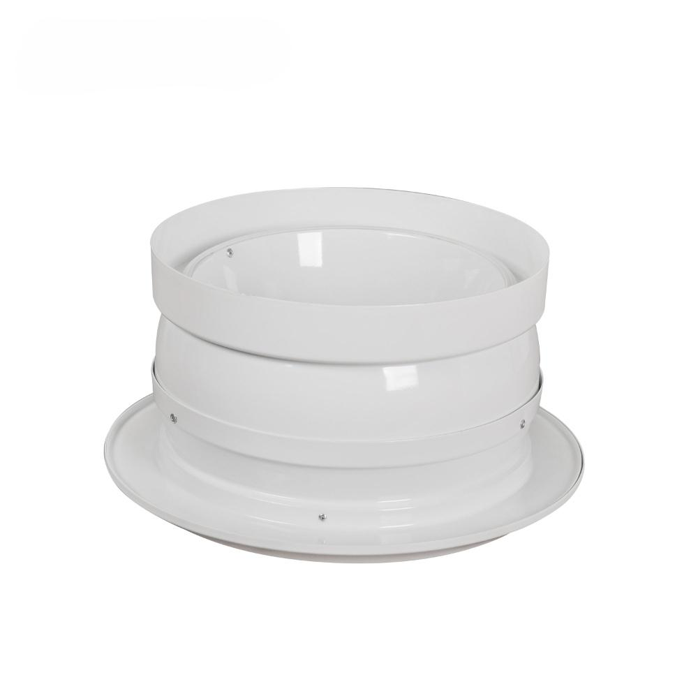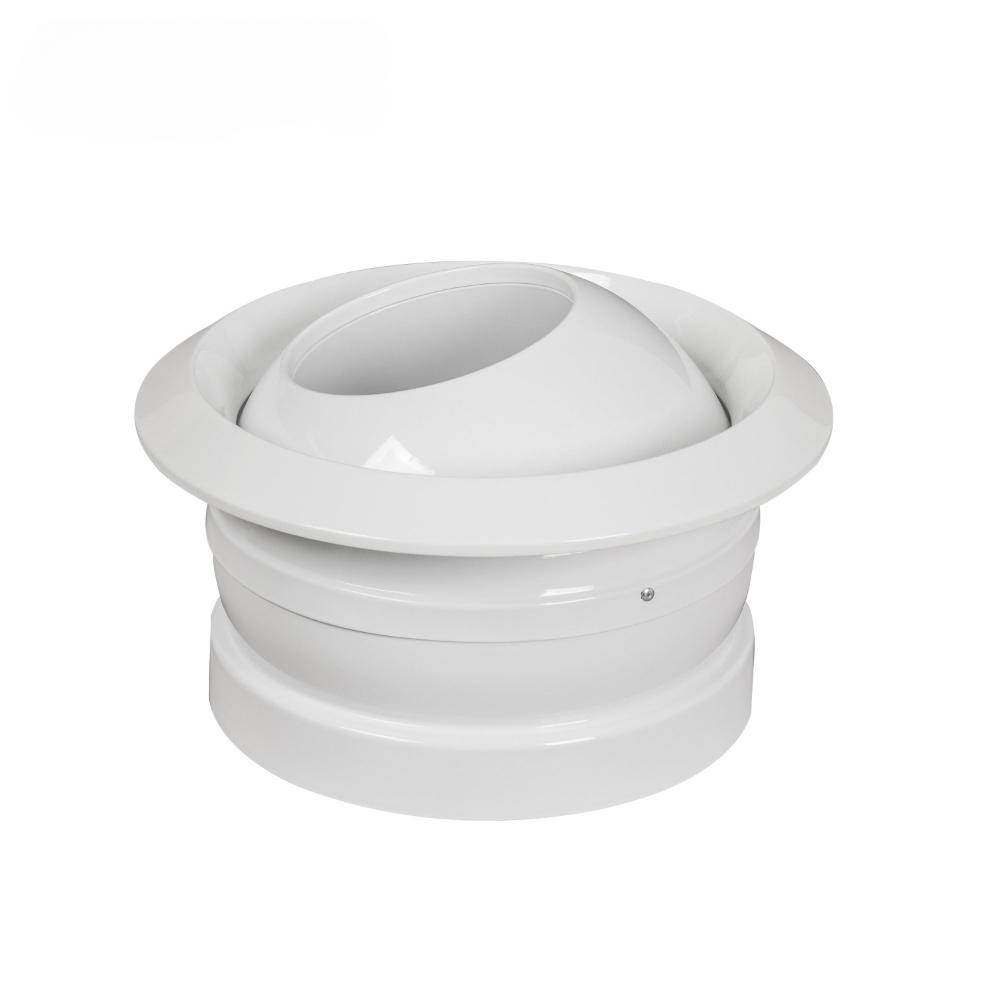 This diffuser features an aerodynamic design with concentric rings and a pivoting eyeball adjustment mechanism, allowing directional control up to 30° from its axis.