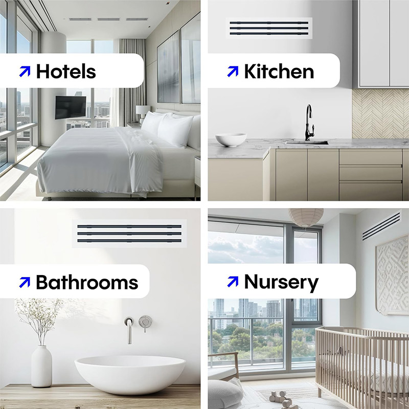 Ideal for offices, conference rooms, hotels, healthcare facilities, and retail spaces where precise air distribution and aesthetic integration are essential.