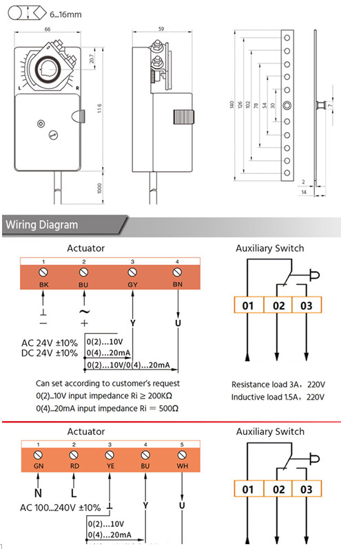 This damper actuator is powered by an imported DC motor or brushless motor, offering torque options of 2 Nm, 4 Nm, 6 Nm, 8 Nm, 16 Nm, 24 Nm, 32 Nm, and 40 Nm. It can be directly applied for angular stroke control in air or water systems, supporting control signals of 0–10 V (or 2–10 V) and 0–20 mA (or 4–20 mA). The actuator also provides configurable current or voltage signal feedback that can be interchanged as needed.