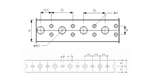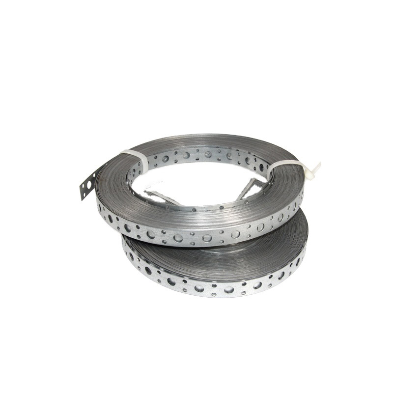 Perforated galvanized band, crafted from galvanized perforated steel, features an assortment of holes designed to accommodate various fixings such as threaded rods, clamps, and bolts. The smaller holes are suitable for use with rivets, screws, or nails. Easily cut or bent, this band offers a quick and reliable fastening solution for general construction and a wide range of other applications.