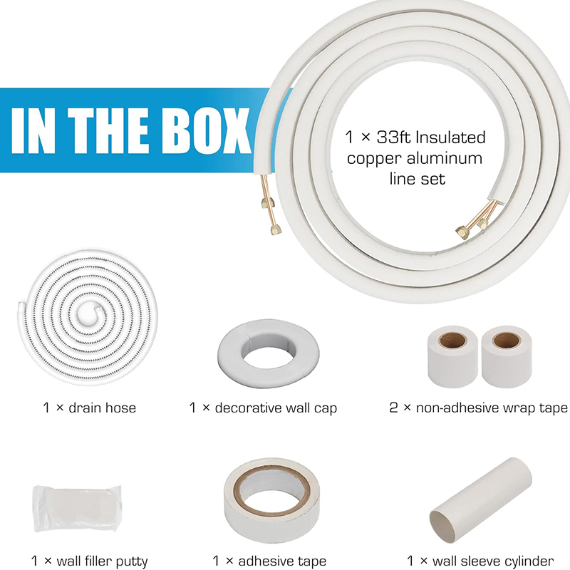 It includes pre-insulated copper tubes and typically comes with installation accessories (such as drainage hoses and sealing tape).